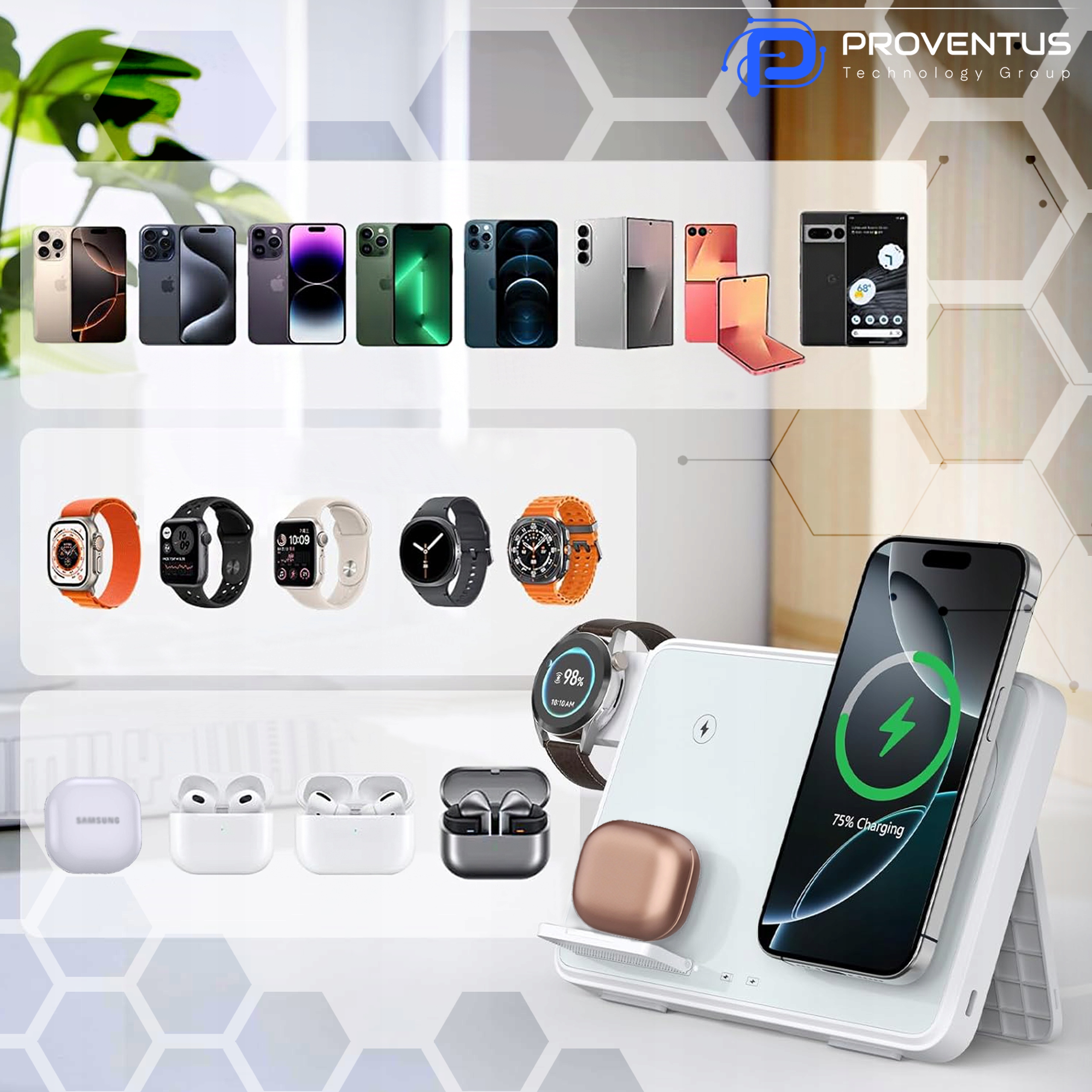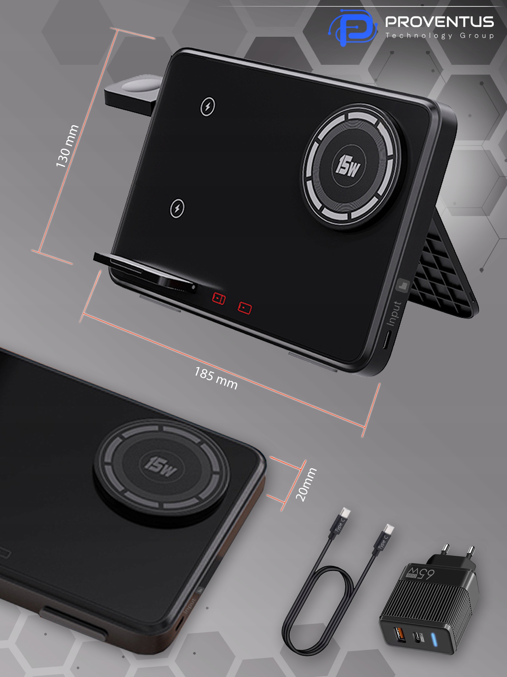 - 4w1: Umożliwia jednoczesne ładowanie trzech urządzeń: smartfona, smartwatcha i słuchawek bezprzewodowych ładowanych bezprzewodowo