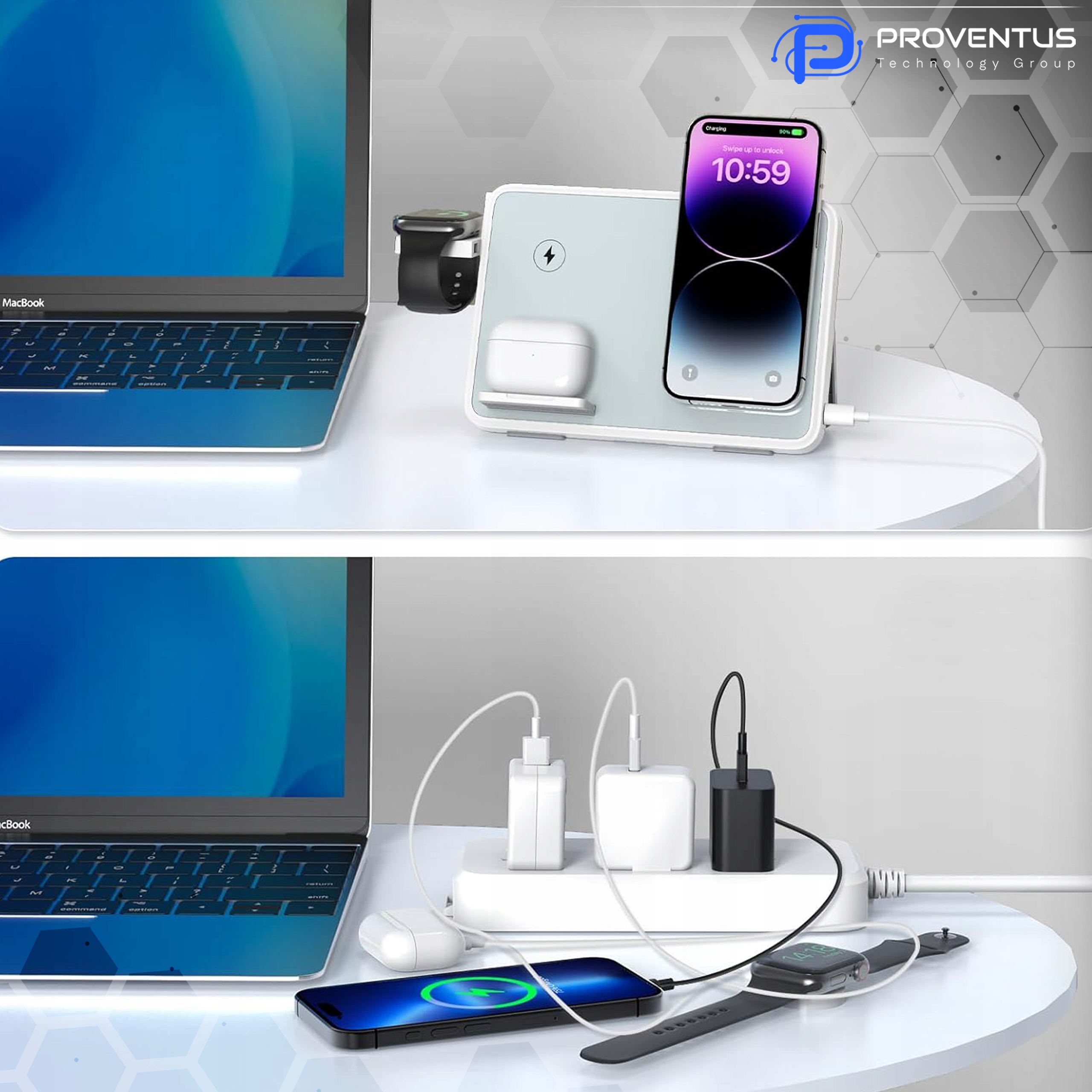 ✅Ładowanie trzech urządzeń na raz – Stacja 4w1 pozwala na jednoczesne ładowanie telefonu, zegarka i słuchawek za pomocą jednego kabla, ograniczając liczbę przewodów.