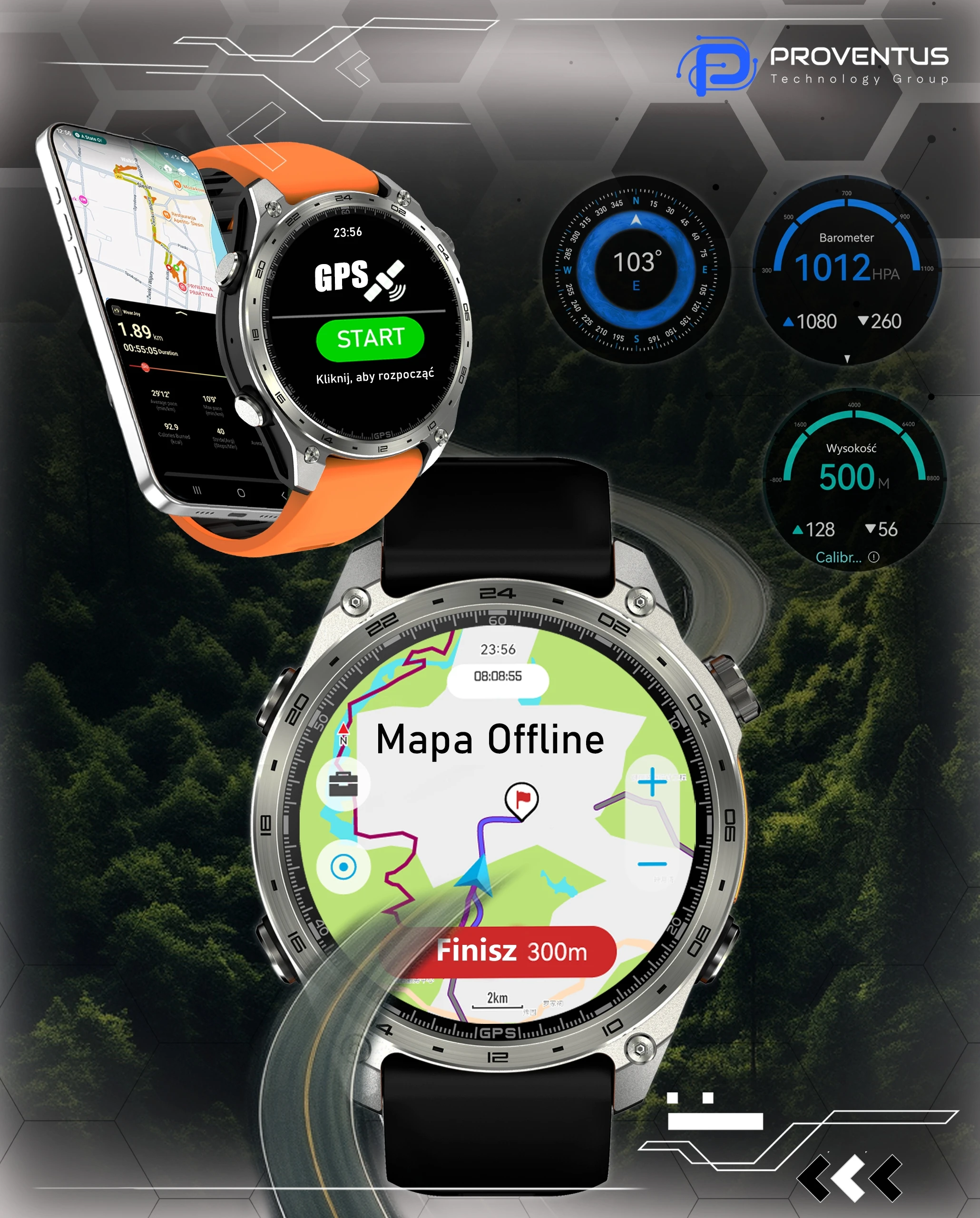 Smartwatch Męski Zegarek Proventus PTG300Pro cazrny — GPS MAPY 4GB AMOLED IP68 Ciśnienie, Funkcja Rozmów, Menu PL